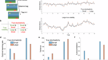In simulations related to Figs. 1–3, timeseries were generated according to the Markov random walk with constant volatility and stochasticity. For these simulations, we assumed \({\lambda }_{v}=0.1\) and \({\lambda }_{s}=0.1\); \({v}_{0}=1\) (average over small and large true volatility) and \({s}_{0}=2\) (average over small and large true stochasticity). For lesioned models in Fig. 3, the corresponding lesion variable was assumed to be fixed at its initial value throughout the task.