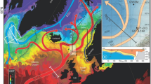 Within the Nordic and Barents Seas, there exist three major boundary currents where water mass modification occurs (Fig. 1): the East Greenland Current (EGC) that flows southward along the East Greenland shelfbreak/upper-slope from Fram Strait to Denmark Strait17,18; the Norwegian Atlantic Current that flows northward through Fram Strait into the Nansen Basin as the Svalbard Branch (SB)7,8; and the Barents Sea Branch (BSB) that progresses from the Norwegian Sea through the Barents Sea towards Novaya Zemlya6,19,20. These latter two branches merge in the Arctic Ocean to form the circumpolar Atlantic Water Boundary Current. Water mass modification also occurs throughout the central Nordic Seas within the Norwegian Sea’s Lofoten Basin21, as well as within the Iceland and Greenland Seas3,10,13. Both the EGC and SB flow along the shelfbreak and we used this characteristic to define the orientation of the domains for these currents (see Fig. 1); for the BSB the domain was defined based on the representation of its spatial extent22. For all three currents, we assume a width of 100 km (results were not sensitive to this width).