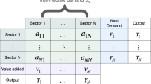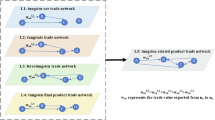 In any case, we can obtain two different weights for a pair of countries based on the data reported at BaC from “Export” and “Import” reports. Then we can have the following two different cases: (a) that the amount \(E\left(i,j\right)\) reported by country i as exported to country j coincides with the amount \(I\left(j,i\right)\) reported by j as imported from i; (b) that \(E\left(i,j\right)\ne I\left(j,i\right)\). In the case (a), we simply add a directed arc from i to j with the weight \(E\left(i,j\right)=I\left(j,i\right).\) In the case (b), we assume that i exports \(\max \left[E\left(i,j\right),I\left(j,i\right)\right]\) to j. We designate by \(\tilde{A}=\tilde{A}\left(G\right)\) the adjacency matrix of the network G. Notice that \(\tilde{A}\) is not necessarily symmetric because \({\tilde{A}}_{ij}=\max \left[E\left(i,j\right),I\left(j,i\right)\right]\) is not necessarily the same as \({\tilde{A}}_{ji}=\max \left[E\left(j,i\right),I\left(i,j\right)\right]\). Here we normalize the adjacency matrices by \(A=\tilde{A}/{\sum }_{i,j}{\tilde{A}}_{ij}\).