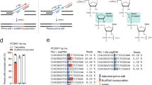 Another application of PE is to introduce small indels1,2,3. As small indels can be readily resolved by endogenous MMR10, we sought to use an alternative strategy to enhance the indel-editing efficiency of PE3. Compared to canonical sgRNA, pegRNA contains two extra parts, i.e., PBS and RTT, at its 3′-end. We assumed that the small hairpin of regular pegRNA could be broken up by the free swinging of PBS and RTT, thus compromising the secondary structure stability of pegRNA (Fig. 2a, left panel). Therefore, we altered the backbone of pegRNA to stabilize its secondary structure by inserting a C/G pair (apegRNA-1) or changing each non-C/G pair to a C/G pair (apegRNA-2, -3, -4, -5, Supplementary Fig. 11a) in the small hairpin of pegRNA. We observed that apegRNA-2, which has a C/G pair at the bottom of the small hairpin, induced intended indel editing with higher efficiency than the regular pegRNA and other apegRNAs (Supplementary Fig. 11b). Furthermore, we changed more A/U pairs to C/G pairs in the small hairpin or engineered pegRNA according to a previously published method17 (Supplementary Fig. 11c), but the intended indel frequencies induced by the corresponding apegRNAs were not significantly different from those induced by regular pegRNAs (Supplementary Fig. 11d).