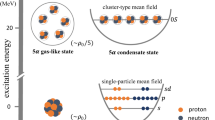 Following the cases of Be isotopes, we analyze the density distribution of the 0\({}_{1}^{+}\) state in terms of Q-aligned states. Figure 6c shows its density profile on the yz plane. For comparison, Fig. 6b displays the calculated density of the α particle. The peak values are similar between panels b and c. The pattern of Fig. 6c resembles the one in Fig. 1c–i. Three (α-like) clusters are close-lying in both panels. In the former, the distances between the nearest peaks are ~1.9 and ~2.4 fm (if preferred, see two-dimensional plot in Supplementary Figure 1). These are smaller than the distance for 8Be (~3.5 fm), and this structure looks like Fig. 1c–i, being closer to a quantum liquid (i.e., normal nuclear matter with a basically constant nucleon density) rather than well-separated α clusters. The lower density region in the center of the nucleus (Fig. 6c) is seen. Although this contradicts the naive independent particle model with the filling of the lowest s1/2 orbit, this trend is consistent with experiment43.