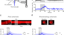 As expected, CO2 added to the inspired air increased the global CBF (Figs. 2c, d; 3b, c; Supplementary Fig. 4). Therefore, it could be argued that during hypercapnia increased neuronal activity fails to trigger a neurovascular response over and above the elevated CBF because the cerebrovascular reserve is exhausted by the potent dilatory action of CO2 on brain vasculature. In conditions of systemic acetazolamide action, 10% inspired CO2 increased the CBF to ~280 ml 100 g−1 min−1 (Fig. 2c), likely revealing the cerebrovascular reserve in our experimental model. CO2 given in the inspired air in concentrations of 5% and 10% increased the CBF to ~130 and 210 ml 100 g−1 min−1, respectively, while the peak CBF response to somatosensory stimulation (i.e. the difference between the baseline CBF and peak increase in CBF) recorded in control conditions (normocapnia) was 39 ± 5 ml 100 g−1 min−1 (n = 22) (Figs. 2c, e; 3c, d). As the sum of these CBF values (210 ml 100 g−1 min−1 peak CBF at 10% CO2 + 39 ml 100 g−1 min−1 peak neurovascular response) is lower than the CBF recorded at hypercapnia following systemic acetazolamide treatment (280 ml 100 g−1 min−1), the inhibition of the neurovascular response by exogenous CO2 cannot simply be explained by the exhaustion of the cerebrovascular reserve.