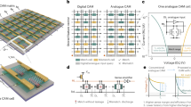As a proof of concept, a three-layered memory stack has been fabricated via sequential deposition of Ti, Pt and spin-coating MoS2. The overview of the 3D stacked MoS2 memristor and the corresponding electrical measurements can be found in Supplementary Fig. S25. To study the structure of the 3D stacked MoS2 memristor, cross-sectional TEM and energy-dispersive X-ray spectroscopy (EDS) were carried out. As shown in the Fig. 5a, the 3D stacked MoS2 memristor features a simple configuration in which the adjacent memory layers have the shared contact, demonstrating the successful fabrication of the 3D stacked MoS2 memristor. The MoS2 layers in the top, middle and bottom memristor show similar thickness of around 10 nm, which indicates the controllability of the deposition process and excellent uniformity of the solution-processed MoS2 film. A high-resolution cross-section TEM taken in the middle layer shows the intimate contact between MoS2 and electrodes, ensuring the efficient charge transport and intactness of the structure (Fig. 5b). The delicate 3D structure has been further elaborated by the elemental mapping, which shows the alternative distribution of Pt, Ti, and MoS2 in sequence (Fig. 5c). Each representative layer of the MoS2 memory stack can be accessible and programmable independently, exhibiting stable and bipolar switching characteristics analog to their planar memristor counterpart (Fig. 5d, Supplementary Fig. S25d–f). Ultimately, a monolithic 3D circuit has been proposed based on the solution-processable 3D MoS2 memristors. Figure 5e depicts a vertically stacked memory architecture with solution-processed 2D MoS2 thin film as the active switching layer, sandwiched between metal lines of top and bottom electrodes. Etch node at the cross-point of the arrays represents an individual memory cell. Benefits provided by room-temperature process, the storage nodes are vertically stacked in a facile manner through a sequential spin-coating of 2D MoS2 and deposition of metal contacts. Based on our previous reports on M3D integration26,49, inter-layer dielectric between each layer of metal lines and selectors at each node of cross-point can be readily integrated in our monolithic 3D circuits to minimize the cross-talk issue and accurately program each memory cell. As an example, the M3D integrated one transistor one RRAM (1T1R) arrays with corresponding circuit diagram are illustrated in Supplementary Fig. S26. Our demonstration shows that the solution-processed 2D materials can be 3D monolithically integrated in back-end-of-line (BEOL) for high density embedded memory for storage and analog computing.