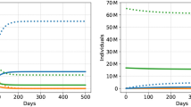 The wage rate wt is paid to all individuals, per effective unit of labor \({\phi }_{t}^{m}{l}_{t}^{m}\), and is calculated from per-capita GDP. We represent the degree to which individuals are able to be productive at work by ϕm (labor productivity). We assume that symptomatic individuals are less productive, such that ϕS = ϕR = 1 and ϕI < 1, reflecting the average decrease in productivity of infectious individuals (accounting for the share of asymptomatic and pre-symptomatic individuals, similar to24—see SI 2.1.1). Following standard practice, the price of consumption p is normalized to 1. Finally, market equations that state how individuals are embedded in a broader economy are described in the SI.