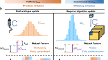 This work assumes that the analogue memory devices within crossbar arrays are programmed in a row-wise iterative fashion using a delayed verification strategy. Because analogue memory devices can exhibit some degree of conductance instability after the application of a programming pulse, it makes sense to maximise the time between successive programming pulses to allow the analogue memory devices as much time as possible to stabilise. We therefore cycle through the rows of the crossbar array many times while applying only one programming pulse per row (where appropriate), as opposed to programming an entire row to completion before moving onto the next row. This results in \(G(t)={G}_{0}{(t/{t}_{0})}^{-\nu }\), where \({t}_{0}=20\) seconds. We have previously employed this weight programming time-scale as an effective compromise between conductance stability and programming speed for the programming of millions of weights40.