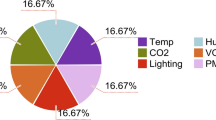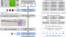 EnergyPlus was used to simulate annual energy usage within a previously defined commercial reference space, described in72. A standard hourly occupancy schedule was assumed for the space85, with an occupancy density of 0.0538 m2/person. Non-exterior walls, floors, and ceilings were set as adiabatic. Opaque walls were modelled with a U-value of 0.472 W/m2K. A fresh air supply of 0.0125 m3/s/person was used, and we assumed that 70% of sensible heat and 65% of latent heat was recovered by the heat-recovery system. Each person generated 125 W of heat, and indoor equipment was modelled with a maximum power density of 5 W/m2. An hourly schedule defined by the National Energy Code of Canada for Buildings85 was used for occupancy, equipment, and temperature setpoints. Such temperature setpoints were defined at 21 and 24 °C when the space was occupied, and at 15.6 and 26.7 °C otherwise. Heating system efficiency was assumed to be 80%, and the air conditioning system was assigned a coefficient of performance of 3.2. An electric lighting power of 99 W (3.4 W/m2) across the space was assumed. Finally, lights were activated daily between 7:00–19:00, and were dimmed to meet a target illuminance while optimizing thermal gains.