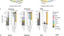 Scaling up zero-deforestation regulations for Brazil’s soy entering the EU is not without risks. While China’s share of Brazil’s total soybean exports grew from 68% in 2011 to 82% in 2017, the EU’s share declined from 18% to 9%, reducing its overall market power (Fig. 3b). In the next decade most growth in soybean demand will come from China (Fig. 3c), which is projected to be satisfied almost entirely with additional exports from Brazil (Fig. 3d). The dependency of Brazil’s soybeans on China’s market may be exacerbated by the onset of the US-China trade war in early 2018, which could trigger significant increases in deforestation30. Traders may choose to drop out of the EU markets or segregate their supply chains into compliant and non-compliant streams if the benefits of selling to regulated EU markets exceed the costs of implementing zero-deforestation supply chain policies across Brazil. This would reduce gross avoided deforestation relative to our analysis and could also weaken the influence of EU-based traders on state-led forest governance in Brazil. Stringent zero-deforestation supply chain approaches may substantially impact rural livelihoods in deforestation risk areas34 if excluding non-compliant actors is cheaper than engaging with them. Moreover, a focus on protecting forests may generate spillovers to non-forest ecosystems. Building capacity among producers (via financing and training) to address non-compliance and improve existing agricultural practices, coupled with reducing incentives for firms to avoid non-compliant actors, may help reduce such negative spillovers from zero-deforestation supply chain policies34.