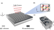 After confirming the physical origin of the multiple peaks of our array, we carried out an angle dispersion extinction measurement (see the “Methods” section) and plot it alongside data from FDTD simulations (Fig. 2c). From the data we can determine the different RA orders that give rise to the optical properties of the array (see the calculation of Rayleigh anomalies in the Supplementary Information). In particular, the spectral shape is influenced by the higher (±1, ±1) modes at shorter wavelengths and by the (±1, 0) and (0, ±1) modes at longer wavelengths. The latter lower-order modes overlap with the LSPR deduced from the single-particle extinction peak at certain illumination angles. The coupling of the LSPR to the diffraction orders results in the narrowing of the resonance, while, as we show later below, maintaining its direct plasmonic sensing properties when exposed to H2 gas.