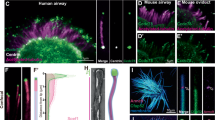 To address whether CFAP20 is required for motile cilia functions in zebrafish, we looked for phenotypes that typically occur in zebrafish larvae and adults when motile cilia are disrupted. Homozygous mutant cfap20−/− zebrafish display various phenotypes that align exactly with those predicted from motile ciliopathies in larval and adult fish. Homozygotes are distinguishable from siblings by anterior-posterior body axis kinks, or ventral body axis curvature at 48 hours post fertilisation (hpf) (Fig. 2d, arrows). Body curvature persists through 7 days post fertilisation (dpf), and pronephric duct cysts develop (Fig. 2e, arrowhead). Mutants also exhibit a significant increase (~15%) in frequency of cardiac situs defects (abnormal left-right axis asymmetry) compared to WT controls (Fig. 2f). Although the severe ventral body curvature phenotype seems incompatible with life, a subset of cfap20−/− homozygotes with kinked body axes survive to adulthood. Adult cfap20−/− homozygotes display severe spinal curvature (Fig. 2g, h), as observed in other zebrafish mutants that model motile ciliopathies27,28,29,30,31. The specificity and attribution of these phenotypes to cfap20 was independently supported via mRNA rescue experiments described below, and via gene knockdown using previously-described morpholino oligonucleotides (MO) that target cfap2016. Knockdown of cfap20 induces increasingly penetrant phenotypes in a dose-response format (Supplementary Fig. 3a–c), supporting MO fidelity. Knockdown of cfap20 closely phenocopies the cfap20−/− mutants, including ventral body curvature and cardiac/gut situs defects at 48 hpf (Supplementary Fig. 4a–f).