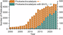 PEC measurements were carried out using a CHI 660E potentiostat. A three-electrode cell with a flat quartz window was used, in which a Pt wire and an Ag/AgCl electrode were used as the counter and the reference electrodes, respectively. The electrolyte was 0.1 M KPi buffer solution (pH \(=\)7). For sulfite oxidation studies, 1 M Na2SO3 was added to the electrolyte. The electrolytes were purged with argon gas for 30 min before measurement to remove any dissolved oxygen. While the simulated solar irradiance was acquired by illuminating light from a 300 W Xe arc lamp (Oriel Newport) through a neutral density filter and an AM 1.5 G filter. The intensity of the light source was calibrated to 100 mW cm−2 at the surface of the FTO side by a Newport optical power meter. The output spectral distribution of the Oriel Newport lamp is calibrated with the standard AM 1.5 G spectrum. J–V curves were obtained using linear sweep voltammetry which was performed from 0 to 1.23 VRHE at a scan rate of 10 mV s−1. The potential was converted from Ag/AgCl potentials by Eq. (1)