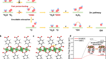 Operando EIS measurements were carried out to distinguish the elementary reactions in HER. As seen in Fig. S37, in which the low and middle-frequency regions in the bode plots are related to the Volmer and Heyrovsky steps, both S-NiBDC and NiBDC followed a Volmer-Heyrovsky mechanism. Compared with NiBDC, S-NiBDC showed a faster decrease in the low-frequency region with increasing overpotential, demonstrating the Volmer step as the rate-determining step (RDS) during alkaline HER that was accelerated on S-NiBDC. In addition, we investigated the deuterium kinetic isotope effects (KIE) of the HER (Fig. 5e, f). The KIE studies reflect the proton transfer kinetics involved in the water dissociation process with the cleavage of HO-H bond, which is the main barrier for the restrained Volmer step. As for S-NiBDC, the primary KIE value in HER overpotential regions fluctuated around 2.12, much lower than that of NiBDC (primary KIE = 3.26), indicating the water dissociation kinetics for S-NiBDC was apparently accelerated, in good consistence with Tafel analyses48,49,50. According to the above results, we can therefore conclude that the introduction of S species not only help to accelerate water dissociation kinetics, but also adsorb with H atom through S-H* bond to facilitate the kinetics of alkaline HER process.