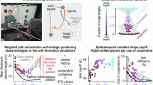 In the cooperative context, players were behaving cooperatively—positioning themselves towards the middle of one of the hemifields and sticking to one side, with a mild but significant shift towards the optimal location as time progressed (β = 0.00086, P = 0.03, fixed effect of trial number in a linear mixed model predicting the distance between players based on dyads and trial number, Fig. 1b, c left column, supplementary Fig. 1a, b, c). Conversely, in the competitive context, participants exhibited more competitive behaviours by positioning themselves closer to the middle of the space (Fig. 1b right) and maintaining the position during the course of the block of trials (Fig. 1c right, supplementary figure 1c). In the intermediate context, participants exhibited a range of cooperative and competitive behaviours (Fig. 1) with a significant shift from the former to the latter and convergence towards the centre as the interaction progressed (β = −0.01, P < 0.005, fixed effect of trial number in a linear mixed model predicting the distance between players based on dyads and trial number, see methods and Fig. 1e mid column).
