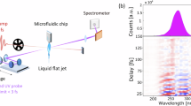 Experiments were performed by recording the differential absorption signals with both parallel (\(\triangle {A}_{\parallel }\)) and perpendicular (\(\triangle {A}_{\perp }\)) relative polarizations between pump and probe beams. From these measurements, the isotropic differential absorption signal is reconstructed via the relation \(\triangle {A}_{{{{{{\rm{iso}}}}}}}=\left(\triangle {A}_{\parallel }+2\triangle {A}_{\perp }\right)/3\). To focus on the population dynamics, all our subsequent analyses are performed using \(\triangle {A}_{{{{{{\rm{iso}}}}}}}\). Differential absorption spectra are processed by applying a Butterworth long-pass filter (see Supplementary Note 7) to remove spurious features caused by the presence of modulations in the probe spectra. The relatively wide absorption spectra of the hydrated electron justify this post-processing method.