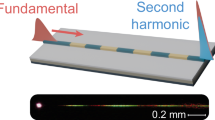 For the characterization of the fabricated device, we coupled the laser beam emitted from the device into a slit of a streak camera, and we measured the spatial-temporal evolution of the laser beam. The slit of the streak camera is parallel to the u-axis of the graded photonic crystal shown in Fig. 2a. The other details of the characterization are provided in the Methods section. The measured streak camera image of the fabricated graded device with biaxial gradation (α1 = α2 = 0.22 nm, β = 0.11 nm) at an injection current of 20.9 A is shown in Fig. 3b, where periodic pulse trains are observed. The camera image for the device with monoaxial gradation (α2 = 0 nm) is shown in Supplementary Note 4. In each pulse, lasing starts from one edge and then propagates in the +u direction, in agreement with the simulated results shown in Fig. 2e. The measured streak camera images for other injection currents are provided in Supplementary Note 5, where stable pulsation is obtained over a wide range of injection currents (8 A ~ 20 A). The temporal change of the output power at 20.6 A after spatial integration is shown in Fig. 3c, where self-pulsation with a pulse width of as short as <30 ps is successfully obtained. Figure 3d–f show the injection current dependence of the output power (peak and average), pulse width, and repetition frequency, respectively. As shown in Fig. 3d, we obtained a maximum peak power of >80 W, which is four times larger than the highest peak power ever obtained among all Q-switched semiconductor lasers without amplifiers22,23. The experimental peak power was smaller than the simulated peak power plotted in Fig. 2, which was likely due to differences between the radiation constant and injection current uniformity of the fabricated device and those assumed in the calculations, resulting in different slope efficiencies between the fabricated and simulated devices. As shown in Fig. 3e, f, the pulse width decreases and the repetition frequency increases as the injection current increases. These results are ascribed to the faster carrier accumulation and the faster band-edge frequency change inside the self-evolving photonic crystal at higher injection currents; these experimental results agree well with the simulated results shown in Supplementary Figure S2. The possibility of the external control of the repetition frequency via the superimposition of a radio frequency signal is discussed in Supplementary Note 6. The measured far-field pattern at 20.6 A is shown in Fig. 3g, where a narrow divergence angle of \({\theta }_{1/{e}^{2}}\) ~ 0.2° was observed. The measured beam pattern is slightly elongated along the v-axis, which indicates incomplete compensation of the carrier-induced refractive-index distribution along the v-axis in the fabricated device (details are explained in Supplementary Note 4). These results confirm that high-peak-power short-pulse lasing based on the self-evolving photonic crystal was successfully realized.