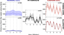We used linear models with departure direction, winter longitude, migration distance and departure timing as response variables and the three genetic markers: MARB-a (a factor with two levels), InvP-Ch1 (a factor with three levels) and InvP-Ch5 (a factor with three levels) as explanatory variables. Models were constructed with R base package “stats”. We reported Type II ANOVA for models with more than one explanatory variable and no interactions and type III ANOVA results for models with interaction term by using R package “Car” (version 3.0-12)28. We initially constructed mixed effect models with timing of departure and tagging year as random factors however, this delivered singular fits due to insufficient sample sizes across categories. Normality of residuals was checked with a Shapiro–Wilk test. For carrying out circular statistics on autumn migration direction we used the R package “circular” (version 0.4-93). Watson’s U2 pairwise comparisons of different groups delivered the same results as linear models (Table S2 and Fig. S5). Circular means were identical to conventional linear means in our data set, which we take as another evidence that linear models are appropriate for the analysis of our data (Table S3 and Fig. S5). Maps in Figs. 1 and 2b and S1, S3 and S4 were created with R package “ggplot2” (version 3.3.6) using continent contours from Natural Earth, naturalearthdata.com/. Heat gradient over the maps in Fig. 1a–d were created with R package “gstat” (version 2.0-8) and the inverse distance weighting power of 3.0. Circular plots were created with ORIANA (version 4.02). All analyses were carried out with R version 4.1.1 (R Core Team 2021).