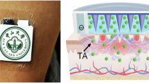 The basic design of self-powered iontophoresis consists of a power source and a drug reservoir facing the skin surface. The drug reservoir is critical to harmlessly facilitate transdermal delivery within a small window of currents/voltages. Hydrogels comprised of cross-linked porous polymer networks possess the advantages of softness and tunable drug-loading capacity, allowing for the facile transport of payload drugs. The commonly used self-powered iontophoresis couples the power source with hydrogel-based drug reservoirs22,23,24, however, this configuration increases the complexity and form factors of the iontophoresis device. In this system, the electrode and hydrogel drug reservoir are separated, which requires a power management module and connection with bulky wires and conductive pastes25, resulting in an additional interface between the drug reservoir and the electrode. The electron current has to be converted to ion current at the electrode/drug reservoir interface to induce the diffusion of therapeutic agents by charge repulsion26. This conversion can induce a local heating effect due to the electrode overpotential, thus decreasing the electrical stimulation efficiency.