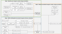 On the other hand, four scenarios with different recovery rates were used: (1) 1-year-completed restoration scenario: restoring all these deforested regions as quickly as possible so that all the restored mangroves could fix carbon for 40 years (Eq. (7)); (2) 5-year-averaged restoration scenario: following some short-term targets that countries have pledged, like Indonesia (rehabilitate all of the damaged mangroves (about 600,000 ha) during 2020–2024)74 and China (restoring 18,800 ha during 2020–2025)75. All of these mangrove area losses globally would be restored within 5 years. Restoration effort and project implementation rate in each country was assumed to be the same; therefore, mangrove restored in the first year could fix carbon for 40 years while those restored in the fifth year could fix carbon for 36 years (Eq. (8)); (3) 10-year-averaged restoration scenario: following median-term goals promoted by international forums and organizations, like COP 26 (halt and reverse forest loss and land degradation by 2030, https://ukcop26.org/) and Global Mangrove Alliance (increase global mangrove area by 20% by 2030, https://www.mangrovealliance.org/). All of these mangrove area losses globally would be restored within 10 years. The assumption used for restoring areas each year by country was similar to 5-year-averaged restoration scenario (Eq. (9)); (4) varying rates across countries scenario: assuming countries pledging or agreeing to support mangrove replanting projects on COP 26 would restore their deforested mangrove area within 10 years (i.e., by 2030), except for countries like Indonesia and China assumed to finish in 5 years with their officially-promulgated policies74,75. Other countries were assumed to reforest their harvested or damaged mangroves within 20 years (Eq. (10)). We multiplied the CO2-eq sequestration potential in certain time intervals by viable restoration area to indicate the maximum climate change-mitigative carbon storage benefit under each mangrove restoration scenario and pathway.