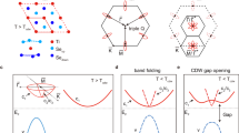 The nature of the phase transition is complicated by the possibility of a Peierls-type CDW transition driven by lattice instability, as opposed to an excitonic transition driven by electron–hole interaction. We performed first-principles calculations for a (\(2\times 2\)) superstructure to check the effects of lattice instability (Supplementary Fig. 6). The calculated total energy per chemical unit is lower by just 0.4 meV for the (\(2\times 2\)) phase relative to the normal phase for single-layer ZrTe2. This is much smaller than the corresponding energy lowering of 5 meV for the (\(2\times 2\)) CDW in single-layer TiSe230. The anharmonic well potential indicates intrinsic lattice instability in TiSe2, whereas the effect is not obvious in ZrTe2 (Supplementary Fig. 8b). Calculated atomic displacements in the CDW phase show δZr is 0.7% of the lattice constant (0.028 Å) and δTe is 0.3% of the lattice constant. As a comparison, the amplitude of δTi is 2.5% of the lattice constant (0.088 Å) in the single-layer TiSe2 in the CDW phase30,35. Although an imaginary phonon mode is found for single-layer ZrTe2 at the \(\overline{{{{{{\rm{M}}}}}}}\) point, the PBE band structure shows no gap opening, indicating a weak lattice instability compared to the other known CDW cases (Supplementary Figs. 6 and 10).