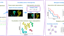 Currently, SM, SL and ST analyses can only be performed separately on adjacent tumor sections. Tumor tissue is highly heterogeneous, so although the distance between adjacent sections is only 10 μm, different sections may still bring certain spatial errors in the process of section preparation and section transfer. 10× Genomics Visium-based ST enables point-by-point sampling and analysis of different micro-regions in H&E-stained tissue section. The sampling spots are distributed over tissue section with a spatial resolution of 100 μm. To more accurately match the spatial characteristics of SM, SL and ST data in tumor microenvironment, we labeled the ST sampling spots-labeled H&E images in this study. The coordinate of first spot in the upper left corner of H&E image was defined as x1y1, the spot with a horizontal interval of 100 μm is x2y1 and the spot with a vertical interval of 100 μm is x1y2. By analogy, we completed the definition of all sampling spots in H&E image (upper panel of Fig. 2a). Then, the gene expression profiles in different micro-regions of gastric cancer tissue can be extracted in a targeted manner using Loupe Browser software (lower panel of Fig. 2a). Furthermore, we can perform dimension reduction and cluster analysis based on tissue in situ gene expression signatures (Fig. 2b), and visualize the spatial features of differentially expressed genes (Fig. 2c).