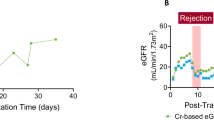 In this study group, kidney length measurement by serial ultrasonography revealed no gross trends when analyzed as absolute kidney length, or percent kidney length change (Fig. 2b, c). Closer examination with fixed effects modeling revealed a small, though statistically significant, increase in kidney length (Supplementary Tables 4 and 5). Extrapolating this model’s estimate suggests an average ~8.0% increase in kidney length per year post transplant. This finding contrasts with previous reports in the literature. In 2000, hDAF transgenic porcine kidneys transplanted into cynomolgus macaques grew in length as much as 30–50% by end of study9. While this study had early and universal rejection (maximum survival 78 days), growth has also been observed in more recent studies. Tanabe et al. transplanted GGTA1 knockout kidneys into baboons and noted expansion of xenokidney volume, ~2–2.5x (maximal survival 193 days)16. Finally, a group at the University of Alabama published kidney growth data for a series of six baboons, using varying genotype porcine donors from United Therapeutics17,18. Kidney length increased up to ~100% over 20 weeks post-transplant. Interestingly, those authors noted that two of their animals had hydronephrosis which was correlated with growth and that graft size significantly decreased after performing redo ureterovesical anastomosis. In this report, while mild hydronephrosis was common early after transplantation, growth was relatively minor. It is notable that transplants in this study that ended earlier (60–120 days) more often displayed a modest growth phenotype (20–50% length increase; Fig. 2c). This suggests one possible explanation for the difference between this study and previously published results is the selection of animals with survival >60 days. This selection event might enrich for animals with fewer technical issues, less parenchymal edema, less severe hydronephrosis, less early rejection, and/or graft dysfunction, thus less “growth.” Another potential explanation might be the strain of pig used. This report uses Yucatan minipigs (mature body weight ~75 kg), while hDAF pigs were generated from Large-White/Landrace hybrid animals (mature body weight \({\ge\!{300}}\) kg) and United Therapeutics/Revivicor utilizes a German-Landrace breed with a growth hormone receptor knockout gene edit for their 10GE pigs™19,20. In summary, in stable NHPs after life-sustaining xenotransplantation, only modest increase in xenokidney length was observed which should not impede clinical translation. Whether this finding would persist beyond 500 days remains unclear with this dataset, but we suggest careful monitoring with scheduled serial ultrasonography for clinical studies.