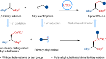 Alkylnitriles play important roles in many application fields due to their unique electronic and structural properties. A large number of pharmaceuticals, bioactive natural products and functional materials contain such structural motifs4,5,6,7,8,9. Meanwhile, the nitrile group is a versatile synthon as it can be readily transformed into a range of useful functional groups, such as carboxylic acids, amides, amines, aldehydes, ketones, etc.10,11,12,13,14. Ever since the pioneering study of Boivin et al. in the 1990s, the iminyl radical-triggered C-C bond cleavage of cycloalkanone oximes has been successfully applied to synthesize a series of functionalized alkylnitriles under cyanide-free conditions (Fig. 1, eq. 1)15,16,17,18,19,20,21,22,23,24. Despite significant progress, the catalytic enantioselective variants of these reactions remain largely unexplored, and the reported reactions were restricted to the Giese additions of alkenes or the couplings with alkynes25,26,27,28. In contrast, the direct stereoselective cross-couplings of the key alkylnitrile radicals with other alkyl radicals to form chiral C(sp3)-C(sp3) bonds were still underdeveloped, especially with the C(sp3)-H as alkyl radical precursors.
