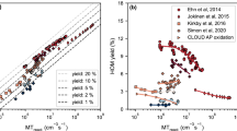 We use the Aerosol Dynamics gas- and particle-phase chemistry model for laboratory CHAMber studies (ADCHAM)49 and the trajectory model for Aerosol Dynamics gas- and particle-phase CHEMistry and radiative transfer (ADCHEM)50. They share a detailed gas-phase kinetic code that combines peroxy radical autoxidation mechanism (PRAM) and Master Chemical Mechanism version 3.3.1 (MCMv3.3.1) using the Kinetic PreProcessor (KPP)51. As described in Roldin et al., 201911, PRAM explicitly simulates the formation of peroxy radicals (RO2) and their oxidation products. We provide the yield, branch ratio, and autoxidation rate constants of main chemical reactions in Supplementary Table 3. Given that the mechanism of fragmentation chemistry is not well understood, ADCHAM tends to underestimate the fragments, the production of which is accompanied by an increase in the NO/MT ratio. Therefore, the model slightly underestimates the HOM yield in the highest NOx step of the constant NO/NO2 experiment with 300 pptv monoterpene (Fig. 1c).