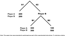 In the Trust game51 an investor (Player A) decides on how much money they want to transfer to the other player, called the trustee (Player B). The trustee receives the investment that is however tripled by the experimenter and decides on how to split the acquired sum. We used a multi-round version of the task101, where the interchange between the investor and the trustee repeated across 25 trials. In the beginning of each trial both players were endowed with 10 points, to avoid investments motivated by inequality aversion. Each point converted to two pence at the end of the experiment. The participants could invest points on a scale from 0 to 10 and the trustee could respond in a binary fashion, by either equalising the payoff, or defecting by keeping all the points in the trial for themselves. Participants played as investors against two pre-programmed trustees: one defected in 7 out of 25 trials (the good agent) and the other defected in 18 out of 25 trials (the bad agent). The feedback was pseudorandomized separately for each participant and was interleaved whereby only two consecutive trials with the same trustee were allowed. To increase ecological validity, the participants were led to believe that they play against two actual people that have already given their answers in advance several weeks before the testing, and that their decision will impact the payoff of these participants. All paradigms were programmed in Visual Basic.