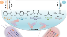 All bacterial strains and plasmids used or constructed in this study are listed in Supplementary Table 1. Primers used in this work for DNA fragment amplification or verification are listed in Supplementary Table 2. Routine cultures of Pseudomonas putida and Escherichia coli for plasmid construction and preculture were grown in 5 mL Luria Broth (LB) medium with appropriate antibiotics (50 μg/mL kanamycin or 100 μg/mL streptomycin) and at 30 and 37 °C, respectively. All batch fermentations were conducted using 50 mL modified M9 minimal medium supplemented with specific carbon sources at 30 °C and 250 rpm. To address the poor solubility of the free acid form of TPA in water, Na2TPA was used as a substrate, along with EG, for pure TPA/EG fermentation.