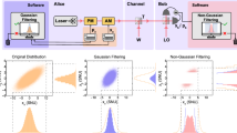 Each round of the B92 protocol works as follows: Alice chooses a bit u ∈ {0, 1} uniformly at random. If u = 0, she prepares the state \({\left|\psi \right\rangle }_{Q}=\left|0\right\rangle\), whereas if u = 1, she prepares \({\left|\psi \right\rangle }_{Q}=\left|+\right\rangle\). She sends \({\left|\psi \right\rangle }_{Q}\) to Bob, who chooses y ∈ {0, 1} uniformly at random and measures the system Q in the computational basis if y = 0 and the Hadamard basis if y = 1. If he obtains outcome “1” (when measuring in the computational basis) or “-” (when measuring in the Hadamard basis), he sets v = y ⊕ 1. Otherwise, he sets v = ⊥. In the sifting step, Bob announces in which rounds he recorded v = ⊥, and Alice sets u = ⊥ for those rounds, too. The bits u and v from all of the rounds form the raw key. To detect possible tampering by Eve, Alice and Bob compare their values of u and v on a subset of rounds.