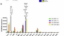 gDNA was extracted using a DNA extraction kit (Qiagen). A total of 500 ng of DNA was diluted in 100 µl of PBS and heated at 95 °C for 10 min to denature the DNA. Two Whatman paper and a Hybond+ membrane (Amersham) was placed in a dot blot apparatus and washed twice with PBS. Samples were immediately placed on ice for 5 min after denaturation and were loaded on the Hybond+ membrane. Membrane was allowed to air dry for 15 min. DNA was then crosslinked in an oven at 80 °C for 1.5 h. The membrane was blocked for 1 h with blocking solution (5% non-fat milk in TBS with 0.05% Tween 20 (TBS-T)). Membranes was incubated overnight at 4 °C under rotation, with 0.5 μg ml−1 anti-CPD antibody (Kamiya Biomedical #MC-062) diluted in blocking buffer. After three 10 min washes with TBS-T the membrane was incubated with matching HRP-coupled anti-mouse secondary antibody (Santa Cruz Biotechnology sc-516102) 1:5000 diluted for 1 h at RT followed by another three washing steps. Signal was detected by chemiluminescence of HRP-coupled secondary antibodies with a ChemiDoc Imaging System. The concentration of the crosslinked DNA was determined by SYBR Gold staining (Thermo Fisher Scientific). CPD-IF was performed following the kit instruction (Kamiya Biomedical).