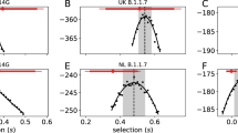 To validate our hypothesis that isolation may be a selection pressure to further drive the evolution of viral phenotypes, we additionally used the longitudinal viral load of SARS-CoV-2 from the BA.1 subvariant in 49 infected patients41 (Table S1), and similarly analyzed those data together with the same data for the Delta variant (see METHODS in detail). The individual viral loads for the Delta variant (red) and BA.1 subvariant (green) are described in Fig. S8, and the estimated population parameters are shown in Table S5. We found that the time-series pattern of viral load for the BA.1 subvariant differed from that for the Delta variant as described in Fig. 4b. We further characterized and compared the distributions of the peak viral load, peak time, and duration of viral shedding in Fig. 4c. Interestingly, while we found almost the same peak time for the BA.1 subvariant viral load with a similar duration of viral shedding (p = 0.09 and 0.48 by the Mann-Whitney-Wilcoxon test, respectively), the comparison of peak viral load suggested a lower peak for the BA.1 subvariant than for the Delta variant (\(p=1.3\times {10}^{-6}\) by the Mann-Whitney-Wilcoxon test). On the other hand, as we expected, the BA.1 subvariant showed an earlier peak time and shorter viral shedding compared with the pre-Alpha and Alpha variants (see Fig. 1a–d vs. Fig. 4b, c). Altogether, these results imply that SARS-CoV-2 evolution toward an earlier peak viral load was maintained but slowed down. Interestingly, similar evolutionary trends were confirmed in a non-human primate model infected with different VOCs of SARS-CoV-242, obviously without NPIs in these cases. We discuss a mechanism behind those convergent phenotypic changes in detail later (see Discussion). Our quantitative empirical clinical data analysis based on our hypothesis could support that SARS-CoV-2 variants have evolved their acute phenotypes via a human-mediated selection pressure such as isolation.