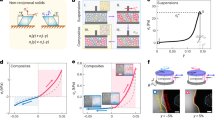 where g± are the inverse functions of f±. The reduced variables \(\tilde{h}\equiv {G}_{{{{{{{{\rm{m}}}}}}}}}{G}_{{{{{{{{\rm{p}}}}}}}}}^{-1}| 1-\phi /{\phi }_{{{{{{{{\rm{J}}}}}}}}}{| }^{-\Delta }\) and \(\tilde{m}\equiv {G}_{\max }{G}_{{{{{{{{\rm{p}}}}}}}}}^{-1}| 1-\phi /{\phi }_{{{{{{{{\rm{J}}}}}}}}}{| }^{-\beta }\) were used to simplify the notation. The derivation is detailed in the “Methods” section. By fitting the data in Fig. 3c to Eq. (5), we obtain the material constants c1 = 1.4 and c2 = 1.3 for the PS–PDMS composites. With all the essential parameters (ϕJ, β, Δ, c1, and c2), we can calculate \({G}_{\max }\) for a given ϕ and Gm. For instance, the colored solid lines in Fig. 2b and c represent the theoretical predictions from Eqs. (4) and (5).