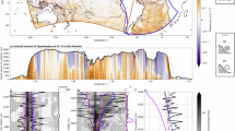 Overhead imagery (Supplementary Movies 1–4) and velocity measurements covering the river left hand side of the minibasins (Figs. 3 and 4) captures paired fluid circulation cells spawned from the current interaction with the distal slope. These cells are visualized by first calculating streamlines from velocity measurements, which capture horizontal gathering of flow into the center of the circulation cells and strong upwelling flow at the cell center (Fig. 3). The circulation cells span the full extent of the ponded flow, which surrounds an inlet flow region defined by high Frd and turbulent flow conditions40. The inlet flow conditions do not cover the full width of the minibasins, and therefore these circulation structures control sediment transport and delivery over the majority of the minibasin area. Fluid movement through minibasins are characterized using vector maps of the temporally averaged depth integrated fluid flux in the down and cross basin directions:
