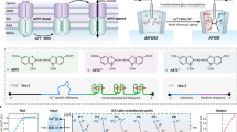 In the initial stages of constructing the DNAzyme-based double control switches (Fig. 2a), we prepared nanochannels functionalized with a single pair of double chains composed of DNAzyme 1 (a Mg2+-specific DNAzyme) and its substrate 1 (sub-1, tagged with cholesterol tail) to mimic the natural nanochannels that are switchable between dewetted (hydrophobic) and wetted states (hydrophilic). Upon hybridization between DNAzyme 1 and sub-1, the inner surface of the nanochannel was modified by the hybridized DNA (dsDNA) initially (state i). When Mg2+ was added, the sub-1 strand was cleaved, and the nanochannel was then switched from state i to state ii, with its inner surface modification changed to single-stranded DNA (ssDNA). Due to the negative charge of DNA backbone, the resulting dsDNA induced a more negatively charged surface with higher ICR ratio in state i than the ssDNA cleaved products in state ii (Supplementary Fig. 8a), because the conformation of the dsDNA exposed the negatively charged backbone to the surface more fully than the ssDNA. As shown in Fig. 2b, the addition of Mg2+ led to the cleavage of cholesterol tagged sub-1, thus the inner surface of the nanochannel changed from state i containing dsDNA to state ii containing ssDNA. Due to the negative charge of DNA backbone, the conformation of the dsDNA exposed the negatively charged backbone to the surface more fully than the ssDNA, the negatively charged [Fe(CN)6]3−/[Fe(CN)6]4− would face greater resistance in approaching to the dsDNA modified surface (state i) than to the ssDNA modified surface (state ii). Therefore, state i showed a higher charge-transfer resistance (Rct) compared with state ii (Supplementary Fig. 8b)47. In addition, the zeta potential of the dsDNA modified surface (state i) was −58.93 mV, which was more negative than that of state ii (−49.89 mV), indicating a more negative surface charge at state i (Supplementary Fig. 8b). Besides, static contact angle experiments showed that the contact angle decreased from (46.43 ± 1.21°) to (26.39 ± 1.97°) after the addition of Mg2+ (Supplementary Fig. 8c), indicating that the cleavage of cholesterol tagged sub-1 induced a more hydrophilic surface at state ii than that at state i. Thus, the addition of Mg2+ transformed the surface wettability from hydrophobic to hydrophilic The DNAzyme-controlled substrate cleavage in the presence of Mg2+ was confirmed by gel electrophoresis (Supplementary Fig. 9). The above results demonstrated that the nanochannel could be reversibly switched between state i and state ii. Furthermore, the state variation of the nanochannel was reversible for more than three cycles (Fig. 2c), which illustrated the capability of DNAzyme-based nanochannel to achieve accurate and reversible control of inner surface wettability. Two control experiments were performed to check the availability and specificity of the DNAzyme-based switching between hydrophobic and hydrophilic (Supplementary Fig. 10). First, inactive DNAzyme 1 (chain-7) and sub-1 were used to modify the nanochannel, and no change of rectification was observed upon the addition of Mg2+ and sub-1 (Supplementary Fig. 10a). Second, different metal ions (Fe2+, K+, Ca2+, Zn2+, Na+, Ba2+, Ag+, 2 µM each) were added as the input signal, and the results showed a negligible change of rectification (Supplementary Fig. 10b). The above results demonstrated the DNAzyme-based wettability switching inside the functionalized nanochannel. To mimic controlled directional flow in natural transmembrane channels, a lipophilic dye, FITC, was selected to test the permeability of the functionalized nanochannel into a single living cell (Fig. 2d). Using HeLa cells as the example, the tip of the nanopipette was inserted into the cell membrane (Supplementary Fig. 11), while a DC voltage was applied to inject FITC into single HeLa cells, as the FITC molecules were contained inside the nanopipettes under different states. As shown in Fig. 2e, the FL of intracellular FITC after injection was significantly higher in cell 3’, indicating an increased lipid permeability in state ii. Compared with state i, the nanochannel in state ii was less attractive to FITC molecules, resulting in significantly increased transport of FITC into cells (Fig. 2f).