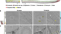 TEM images of ultrathin (70 nm) and 150 nm sections were acquired on the Jeol JEM-2100Plus (200 kV) equipped with LaB6 cathode, TVIPS XF416 CMOS 4k x 4k camera and SerialEM software v. 4.0.349. In order to facilitate the localisation of target cells for cross-correlation with images from brightfield and fluorescence microscopy, montages of root tips (each consisting of several hundred images) were collected at pixel size of 2.83 nm, 0.7 s exposure, and 2x binning. Details were recorded with different pixel sizes depending on the region of interest, 2 s exposure and 1x binning. Data were aligned and pre-processed in IMOD software v. 4.11.450.
