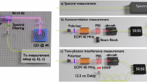 For measurements of the T2 time, an all-fiber-based Michelson interferometer (MI) was implemented22, consisting of a 2 × 2-port 50: 50 fiber beam splitter with both exit ports terminated by a Faraday mirror, reflecting the light with 90 ∘ polarization rotation. The necessary coarse and fine temporal delay is controlled by a variable optical delay stage and a piezo-driven fiber stretcher in the two MI arms, respectively. The single-photon signal is coupled to one input port of the MI and detected at the second input port using a SNSPD. The MI setup in its configuration features 80% overall transmission (excluding the BS) and allows for the measurement of coherence times of up to 1 ns. The maximally achievable interference contrast was measured with a CW laser at 1550 nm to be 98%, limited only by the slight intensity mismatch due to the reduced transmission through the optical delay line. For each temporal delay adjusted via the coarse variable delay line, a fine temporal scan is performed via the fiber stretcher, resulting in interference fringes with an amplitude depending on the overall delay. The interference fringes are evaluated by subtracting a constant amount of dark counts and evaluating the interference contrast via \(v=({I}_{\max }-{I}_{\min })/({I}_{\max }+{I}_{\min })\). Finally, the T2 time is extracted by fitting a two-sided exponential decay to the interference visibility v data as a function of the coarse delay set in the MI with the uncertainty representing the fit accuracy.