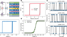Thin film samples of substrate/[W (3)/Ru (10)]2/W (3)/Pt (3)/Co (0.25)/Pt (0.2)/[Co (0.25)/Pt (0.5)]5/Co (0.6)/Ru (0.85)/Co (0.6)/Pt (0.2)/Co (0.3)/Pt (0.2)/Co (0.5)/W (0.3)/CoFeB (0.9)/MgO (1.1)/CoFeB (1.5)/Ta (3)/Ru (7)/Ta (5) were deposited via DC (metallic layers) and RF magnetron (MgO layer) sputtering on the Si substrates with thermal oxide of 300 nm with a base pressure of less than \(2\times {10}^{-8}\) Torr at room temperature. The numbers in parentheses are thicknesses in nanometers. To fabricate the superparamagnetic tunnel junctions, bottom electrode structures with a width of 10 µm were firstly patterned via photolithography and Ar ion milling. MTJ pillar structures with a diameter of ~50 nm for the superparamagnetic behavior were patterned by using e-beam lithography. The encapsulation layer of Si3N4 was in-situ deposited after ion milling without breaking vacuum by using RF magnetron sputtering, and top electrode structures with a width of 10 µm were patterned via photolithography and top electrodes of Ta (5 nm)/Cu (40 nm) were deposited by using DC magnetron sputtering.