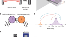 The SAW device consists of a Fabry-Perot Gaussian surface acoustic wave cavity on a single-crystalline substrate formed by two acoustic mirrors composed of regularly spaced curved metallic reflectors. Two non-collinear optical beams, a pump field, and a Stokes field, are incident in the region enclosed by the acoustic mirrors (Fig. 1a). The confined Gaussian surface acoustic mode can mediate energy transfer between the two optical fields provided phase-matching (momentum conservation) and energy conservation relations are satisfied, as is the case with Brillouin scattering from bulk acoustic waves57. For pump and Stokes fields with wavevector (frequency) \(\vec{{k}_{p}}({\omega }_{p})\) and \(\vec{{k}_{s}}({\omega }_{s})\), respectively, that subtend equal but opposite angles, θ, with respect to the surface normal (z-axis), the optical wavevector difference can be approximated as \(\vec{\Delta k}\, \approx \, 2{k}_{0}\sin \theta \hat{x}\), assuming \({k}_{p}\, \approx \, {k}_{s}={k}_{0}\) and for \(\hat{x}\), a unit vector parallel to the surface; the corresponding optical frequency difference is \(\Delta {{\omega }}={\omega }_{p}-{\omega }_{s}\) (Fig. 1b). Note that the magnitude of the optical wavevector difference is tunable by the optical angle of incidence. For the case of freely propagating surface acoustic waves, the acoustic dispersion relation is linear and can be expressed as \(\Omega={{{{{{\rm{qv}}}}}}}_{{{{{{\rm{R}}}}}}}\), where \(\Omega,{{{{{\rm{q}}}}}}\), and vR are the phonon frequency, phonon wavevector, and Rayleigh SAW velocity, respectively. The phase-matched phonon wavevector (q0) and frequency (\({\Omega }_{0}\)) are then given by the relations: \({q}_{0}=\Delta k=2{k}_{0}\sin \theta\) and \({\Omega }_{0}={q}_{0}{{{{{{\rm{v}}}}}}}_{{{{{{\rm{R}}}}}}}\). A propagating SAW, therefore, yields a single-frequency optomechanical response, similar to the standard Brillouin response in bulk materials from propagating longitudinal waves. However, the accessible phonon spectrum is significantly modified in the presence of a surface acoustic cavity and optical beams with finite beam sizes, as illustrated by the modified acoustic dispersion plot in Fig. 1c. First, because standing SAW cavity modes are formed, the phonon wavevectors and frequencies become discretized to specific values \({q}_{m}=\frac{m\pi }{{L}_{{{{{{\rm{eff}}}}}}}}\) and \({\Omega }_{m}={q}_{m}{{{{{{\rm{v}}}}}}}_{{{{{{\rm{R}}}}}}}\), respectively, characterized by mode number m, where the free spectral range of the cavity is \(\Delta \Omega=\frac{\pi {{{{{{\rm{v}}}}}}}_{{{{{{\rm{R}}}}}}}}{{L}_{{{{{{\rm{eff}}}}}}}}\), and \({L}_{{{{{{\rm{eff}}}}}}}\) is the effective cavity length. Second, unlike ideal mirrors, acoustic Bragg mirrors only efficiently confine a finite number of longitudinal modes (blue circles in Fig. 1c) determined by the reflectance and periodicity of the metallic reflectors1. Finally, because the optical fields are Gaussian beams with finite spatial extents, appreciable optomechanical coupling exists over a range of optical wavevectors values centered around the phase-matched configuration, \(\Delta k={q}_{m}\). The effective optomechanical coupling rate to the cavity mode m, g0, varies as a function of optical wavevector mismatch as \({g}_{0}\, \left(\Delta {{{{{\rm{k}}}}}}\right)\propto \exp (-(\Delta {{{{{\rm{k}}}}}}-{{{{{{\rm{q}}}}}}}_{{{{{{\rm{m}}}}}}})^{2}/{\delta}{{{{{{\rm{k}}}}}}}^{2})\), where \(\delta k=2\sqrt{2}/{r}_{0}\) and r0 is the radius of incident optical fields. Equivalently, the coupling rate can be expressed as a function of the angle of incidence as \({g}_{0}\, \left(\theta \right)\propto \exp (-({{\theta }}-{{{\theta }}}_{{{{{{\rm{m}}}}}}})^{2}/{{\delta }}{{{\theta }}}^{2})\), for small angles such that sinθ ≈ θ and where θm is the phase-matching angle of the acoustic cavity mode given by \({\theta }_{m}=\frac{{q}_{m}}{2{k}_{0}}\). The corresponding angular bandwidth is given as \(\delta \theta=\frac{\delta k}{{k}_{0}}=\frac{\sqrt{2}}{{r}_{0}{k}_{0}}\) (see section S2 of Supplementary Information). The resultant optomechanical spectrum consists of several discrete resonances from SAW cavity modes which lie both within the acoustic mirror and optical phase-matching bandwidths (unconfined radiative longitudinal modes are indicated by gray circles in Fig. 1c).