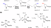 G2 (1970 models) gathers 2,4-DAPDH homologs presumably sharing the same native function in the ornithine fermentation pathway42. The highly conserved P1–P21 and the close sequence similarity of their members support this hypothesis (Supplementary Fig. 3). For G1 (1,427 models), the comparison of its sequence logo with G2 indicated a major difference in position P12 but also a conserved Arg in P9 and His in P15, suggestive of a possible substrate similar to 2,4-DAP with a terminal carboxylic group and an amine reacting group further away in the structure. The conserved Arg in P12 (Phe in G2) suggested coordination with a negatively charged group or a proton acceptor functional group in place of the methyl of 2,4-DAP. Docking experiments with this type of substrates were performed with the model of a G1-enzyme from Vulcanisaeta distributa (UniProt ID: E1QRK4) with P1-P21 consensus residues. Computed energies of binding were deemed to be in accordance with a potential reaction (−5.2 to −3.4 kcal mol−1) by comparison with that of 2,4-DAP in AmDH4 (−5.5 kcal mol−1) (Supplementary Table 4). To complete this P12-based substrate search, a virtual screening, using the list of amines provided in Supplementary Data 1, was performed but did not provide any clues about other potential substrates for this group. Also, given that prokaryotic genes involved in a similar pathway are frequently encoded in a single locus with an operonic organization, an analysis based on conserved genomic context was conducted using NetSyn43. However, this did not reveal any clear evidence for the metabolic function of these enzymes (Supplementary Fig. 4).