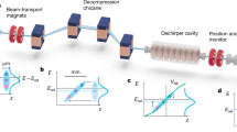 An absolute calibration of the electron and positron numbers is made by using the brightness (pixel counts per unit area) of the in-beam luminescence screen. Specifically, we account for the difference between the amount of light collected in the optical setups used for the in-beam screen luminescence and for the spectrometer screens, considering (i) the different standoff distances, which leads to different solid angle subtended (dΩbeam/dΩspect = 2.7 ± 0.4); (ii) the different camera gain settings used (Gspect = 38 ± 2, Gbeam = 1); and (iii) the different thickness of screen used, where thicker screens le`ad to larger energy deposition per particle (udep,spect/udep,beam = 3.5 ± 0.5). A small \(1/\cos \theta\) geometric correction is applied to the energy spectra to account for the additional path length of Chromox encountered by obliquely-incident deflected particles, where θ = 10° at the screen edge closest to the beam axis, and θ = 25° at the furthest edge.