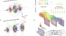 Light fields with twist wavefront of the form e−ilθ, referred to as optical vortices (OVs), show a symmetric hollow intensity profile caused by the on-axis phase singularities (see Fig. 1a). The integer number l is an azimuthal quantum number called topological charge. Allen et al. in 1992 discovered that spatial OVs, such as Laguerre-Gaussian beams, carry a longitudinal orbital angular momentum (OAM) proportional to the topological charge \(l\). This OAM is parallel to the wavevector and propagation direction of the beam1,2. Since then, spatial OVs have been extensively studied and play a crucial role in various fields of physics, including light-matter interaction to manipulate the angular momentum of particles and control their motion3,4, quantum optics to enable entanglement and manipulation of photons for high-dimensional quantum information processing5,6,7, telecommunications to offer increased channel capacity and improved immunity to signal degradation8,9 and holographic data storage to elevate security and depth perception within holography10,11, etc. Benefiting from recent successful developments in ultrafast optics, self-torque beams with time-varying longitudinal OAM have also been proposed through introducing spectrum related azimuthal indices into a pulsed beam12,13,14.