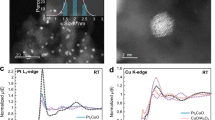 CO oxidation has been widely used as a model reaction for the fundamental study of reaction mechanisms and the surface properties of catalysts. According to previous reports, the pretreatment conditions have a profound effect on the catalytic performance via regulating the oxidation state or the local coordination structure of active site in various bimetallic catalysis systems31. In this work, when the catalysts were pretreated under O2 atmosphere, all samples exhibited bad CO oxidation activity with a complete conversion temperature of CO oxidation >200 °C (Fig. 2a), presumably due to the poor adsorption of CO molecules on active site, according to the only existence of gas CO bands in in-situ DRIFTS results (Supplementary Fig. S4). However, there is a dramatic improvement in activity for all samples with hydrogen reduction at 500 °C. PtCu/MgO exhibited good CO oxidation activity with 100% CO conversion at 130 °C, even can motivate this reaction at ~50 °C (Fig. 2b). For monometallic Pt and Cu samples, the CO complete conversion can only be achieved at 154 °C and 248 °C with few activity below 100 °C. It demonstrated that the hydrogen reduction may not only reduce the oxidation state of platinum and copper species, but also regulate the coordination structure of active site. In order to verify our assumption, the related kinetic data was acquired (Fig. 2c). The apparent activation energy (Ea) of the PtCu/MgO catalyst is around 42 kJ⋅mol−1, which is much lower than that of Pt/MgO (82 kJ⋅mol−1), Cu/MgO (90 kJ⋅mol−1) and other reported Ea values in Supplementary Table S4 (from 45 to 98 kJ⋅mol−1) of Pt-based34,35,36 or Cu-based catalysts22,37, indicating the difference in active structure or reaction pathway. Besides, a long-term catalytic evaluation at 150 °C for PtCu/MgO under a simulative vehicle exhaust condition (GHSV:190,000 ml h−1 gcat−1) showed 94% conversion without any deactivation within 20 h (Fig. 2d). Meanwhile, pure Pt catalyst also showed good stability at 150 °C with a poor conversion efficiency of about 20% under the same test conditions. In addition, PtCu/MgO also exhibited good catalytic stability under water vapor condition (Supplementary Fig. S5). Moreover, PtCu/MgO showed better catalytic activity compared to other platinum-based catalyst in Supplementary Table S5.