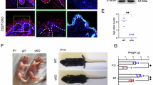 To further confirm whether the TNF-treated Krt32(−/−) mice could recapitulate the gene expression patterns of human PRP diseases, we conducted the RNA-seq analysis of the dorsal skin from Krt32 KO and WT mice. KEGG analysis revealed the enriched NF-κB and TNF pathways in Krt32 knockout mice (Fig. 8D, Supplementary Data 8), consisting with the results from PRP patients with KRT32 mutations. The gene transcription of pro-inflammatory cytokines TNF, IL-1β, and IL-6 showed significant upregulation in KO mouse (Fig. 8E, Supplementary Data 9), RT-qPCR also validated these results (Fig. 8F, G). Meanwhile, IHC analyses demonstrated that IL-1β expression levels were elevated in the epidermis of PRP mouse model (Fig. 8H and Supplementary Fig. 8C).