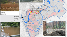 The Hermit’s Peak wildfire began on April 6, 2022, after a prescribed burn on the Santa Fe National Forest became out of control due to high winds in the region. The Calf Canyon Fire was declared a wildfire on April 19, 2022, after a dormant pile burn holdover from a prescribed burn in January 2022 reemerged. The Hermit’s Peak and Calf Canyon wildfires merged on April 23, 2022. Strong winds quickly spread the fire to cover 600 km2 within a month, when it was only 20% contained104. The fire grew to over 1200 km2 and became a gigafire after 2 months, when it was 70% contained around June 15, 2022. The seasonal rain from the Monsoon slowed the HPCC, which became fully contained on August 21, almost 5 months after it began. Our rapid response team37 studied two fluvial networks affected by the HPCC gigafire, which we summarize below. Site characteristics for each subwatershed studied are detailed in Fig. S7 and Table S2. The flow in the streams and rivers of these fluvial networks is associated with groundwater baseflow in the winter, groundwater baseflow and snowmelt in the spring, and monsoonal storms in the summer and fall105.