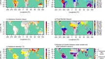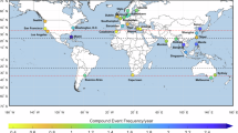 where \(n\) is the number of days in the consecutive event, and \({y}_{i}\) is the daily precipitation. The Gini index ranges from 0 to 1, with the smaller value indicating a more even temporal distribution of precipitation, i.e., 0 represents evenly distributed rain throughout the consecutive event, and the larger value indicating a more discrete distribution, i.e., 1 represents an event with precipitation on only one day. Therefore, the Gini index is sensitive to the number of rainy days during a consecutive heat event.