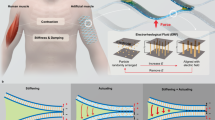 Current soft actuators are mainly driven by fluid13,14, thermal stimulation15, and electrical power16. Among them, electrically powered actuators have many merits, involving fast response, energy efficiency, self-sensing, simple setup, etc. Many related researches are devoted to dielectric elastomer (DE) actuators17,18,19, which are usually miniaturized in actuation force and stroke. Besides, DE actuators usually need prestretch to perform effectively. Recently, some electrostatic actuators have been developed by using liquid-amplified electrostatic force to achieve high performance and versatility. HASEL actuators8,9 revealed the potential of this concept in building large scale artificial muscle. Then electro-ribbon actuators10,11 incorporated liquid-amplified electrostatic force with electrostatic zipping, while removing excess liquid dielectric and encapsulation of HASEL actuators. Such modifications enable electro-ribbon to form various origami structures with different shapes and functions. Using similar working principle to HASEL and electro-ribbon, electrostatic bellow muscle12 (EBM) integrated multiple functions, involving actuating, pumping, and energy harvesting, in a single lightweight device. Unfortunately, these actuators were only tested in aspects of strength, stroke, power density, etc., while their structural properties were ignored in the tests. In fact, when pursuing high performance metrics of actuation, structural stability and impact damping were often sacrificed in electrostatic actuators, making their structural properties quite different from bio-muscle. Due to that, it is essential to integrate electrostatic actuators with structures that are impact damping during operations20.