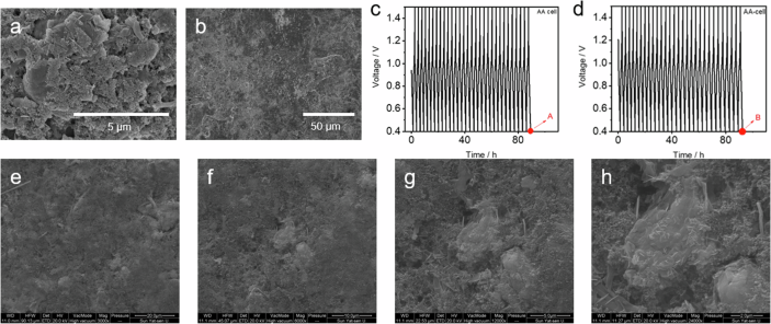 The original version of this article contained another error in Supplementary Figs. 31a-b and Figs. 40a-b, where the authors mistakenly put the identical SEM images for different cycled electrodes. The correct SEM images of Supplementary Fig. 31a, b have been updated in the new Supplementary Information file to reflect the correct data for the surface morphology information of different cycled electrodes. Moreover, GCD curves of associated electrochemical data for Supplementary Figs. 31a and 40a have been added as Supplementary Figs. 31c and 40c. For reproducibility purposes, GCD curves of the newly assembled Zn/NVO and AA-Zn/NVO coin cell with WSE electrolyte have been provided in Supplementary Figs. 31d and 40d. In order to improve the clarity of the surface morphology for the electrodes, additional SEM images with different magnification are also provided in the new Supplementary Figs. 31e–h and 40e–h. The Supplementary Fig. 31 and Fig. 40 before and after correction are shown below. This correction should not impact the conclusions drawn in the work.