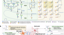 Our findings highlighted a significant correlation between specific gangliosides and N-glycans, which is consistent with previous studies on the interdependence of these two molecules. This correlation also aligns with the regional segregation trend shown in Fig. 6b, c. For example, the inhibition of N-glycan trimming by glucosidases I and II in mouse and human embryonic brain dramatically alters ganglioside composition by inhibiting synthesis of highly sialylated and complex b-series gangliosides at the time point of proliferation and migration of neural progenitor and intermediate neuron54. On the other hand, a decrease in mature-type core α1,3-fucosylated N-glycans and an increase in unusual N-glycans with terminal fucosylated hexose structure were observed in Caenorhabditis elegans in which α-glucosidase I gene that encodes a polypeptide with 36% identity to human α-glucosidase I was knocked down by RNAi55. In a similar vein, our dataset showed that less sialylated and a-series gangliosides (GM3 36:1;O2 and GD1a 36:1;O2) were significantly low in Group I, while species with higher degree of sialylation (GT1 38:1;O2 with mono-/di-O-acetylation and GQ1 38:1;O2 without or with mono-/di-O-acetylation) were abundant (Fig. 6b). Additionally, we observed an increase in a N-glycan having core fucose residue (Hex3HexNAc6Fuc1) and a decrease in species with fucosylated hexose in Lewis Y(B) epitope (Hex5HexNAc4Fuc3 and Hex5HexNAc5Fuc3) in Group I (Fig. 6c). These findings demonstrate a significant convergence in the spatial dynamics of N-glycans and gangliosides across the brain56,57,58. Our study is the first to examine the relationship between these two molecules at both molecular and phenotype levels across the nine brain regions, offering a comprehensive perspective on the entire molecular profile within the central nervous system. This approach not only confirms the intricate relationship between N-glycans and gangliosides but also sets the stage for future research to further understand their complex interactions.