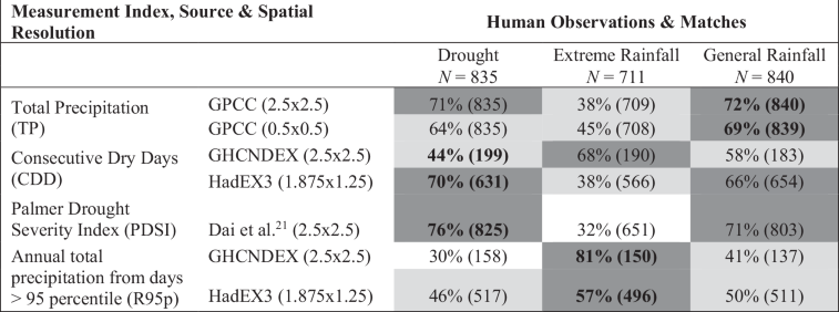 Table 1 Percent agreement between human observations of rainfall changes and instrument-based precipitation indices for the globe