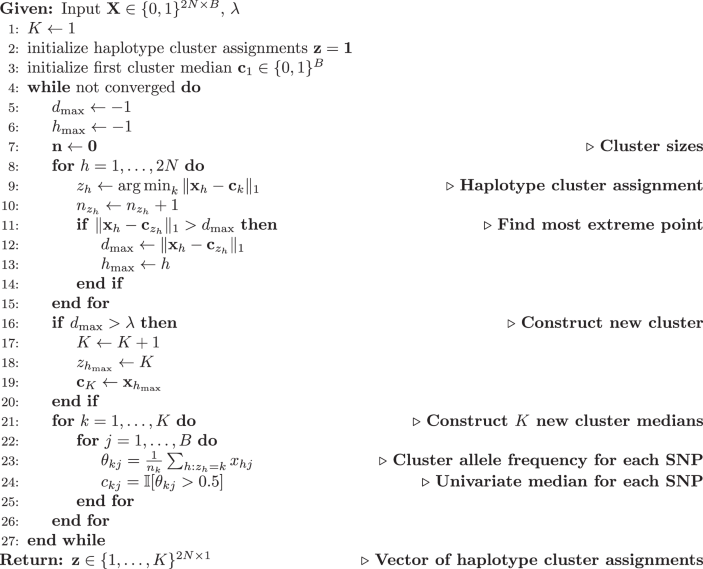 where xh ∈ {0, 1}B is the h-th haplotype, ck ∈ {0, 1}B is the k-th cluster median, zh ∈ {1, …, K} is the haplotype cluster assignment of the h-th haplotype for h = 1, …, 2N and ∥ ⋅ ∥1 being the L1-norm. The added penalty term penalizes the creation of clusters, and a new cluster will be generated if the Manhattan distance exceeds the specified λ parameter. We utilize the delayed cluster creation process introduced in PDC-DP-Means, where only one new cluster can be created per epoch, which allows for a fast parallelized implementation of the algorithm.